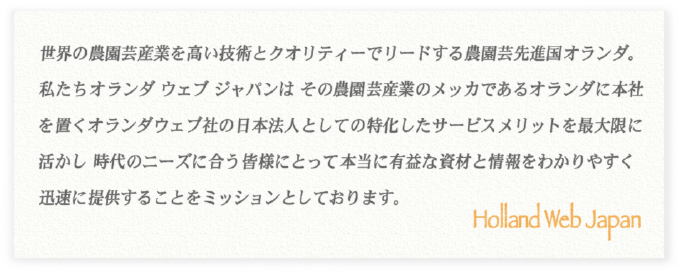 現在のオランダウェブは、温室建物以外の生産者が生産をする為の必要な製品の全てを、種•苗から 資材•ノウハウの提供に努めております。